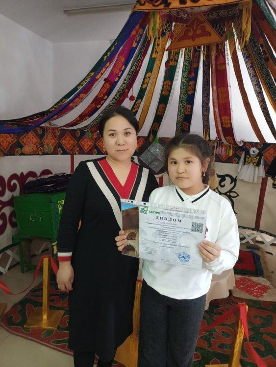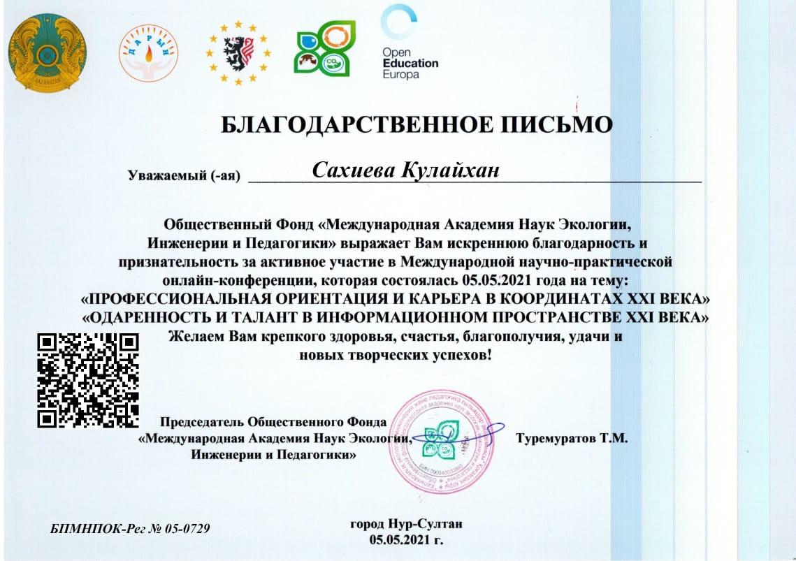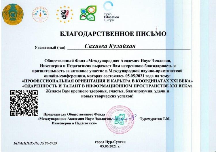 Ағылшын тілі пәнінің мұғалімі Сахиева Күлайхан «XXI ғасырдағы ақпарат кеңістігінде дарынды және талантты тұлғалардың өз орнын табуы» халықаралық ғылыми-практикалық онлайн-конференциясына қатысқаны үшін «Алғыс хат» берілді. «Халықаралық Экология, Инженерия және Педагогика Ғылымдар Академиясы» Қоғамдық қоры ұйымдастырған «Little scientist» тақырыбында IV Республикалық ғылыми жобалар байқауына қатысушыларды дайындап, белсенділік танытқаны үшін Алғыс хатпен ағылшын тілі пәнінің мұғалімі Сахиева Күлайхан марапатталды.