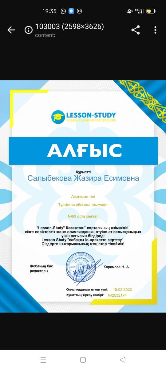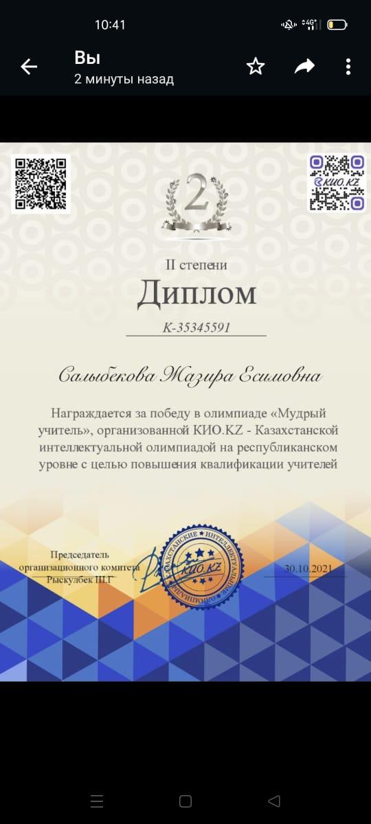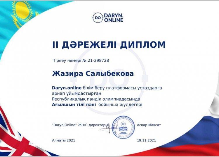 Daryn.online білім беру платформасы ұстаздарға арнап ұйымдастырған Республикалық пәндік олимпиададада ағылшын тілі пәнінің Салыбекова Жазира ІІ дәрежелі дипломмен марапатталды.