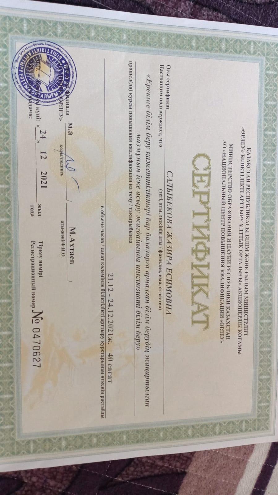 Ерекше білім беру қажеттіліктері бар балаларға арналған білім берудің жаңартылған мазмұнын іске асыру жағдайында инклюзивті білім беру бойынша оқып, Салыбекова Жазира сертификатталды.