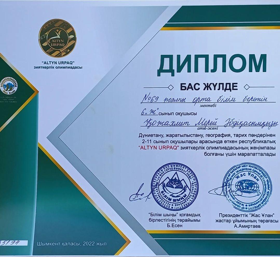 20 май 2022 0 1 2 3 4 5 " ALTYN URPAQ" зияткерлік олимпиадасы Дүниетану,жаратылыстану,география,тарих пәндерінен 2-11 сынып оқушылары арасында өткен республикалық " ALTYN URPAQ" зияткерлік олимпиадасының Бас жүлде жеңімпазы Қожахмет Мерей Әбдіқасымқызы марапатталадыжетекшісі:Үсенова Малика