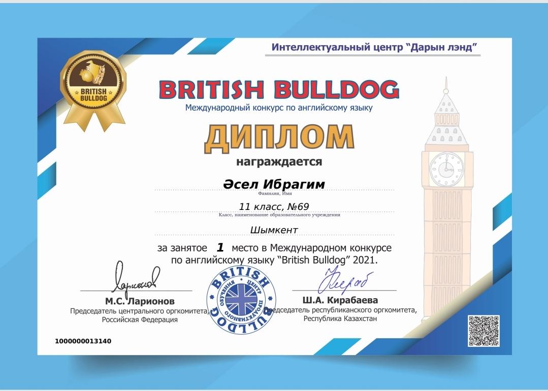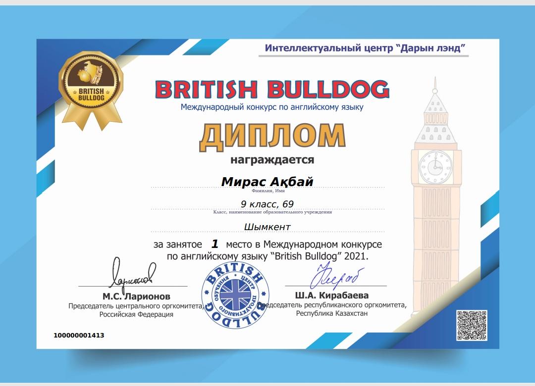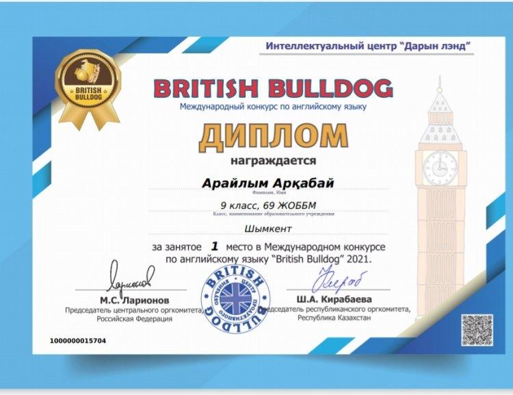 Мектебіміздің 6,9,10,11 сынып оқушылары Ақбай Мирас, Арқабай Арайлым, Ерғали Сауле, Ибрагим Асел, Ибрагим Аяна "British Bulldog " атты Халықаралық конкурсқа қатысты. Сайыстан жүзден жүйрік сараланып марапатталды.Ел ертеңі білімді жастардың қолында.Сапалы білім, саналы тәрбие беру әр ұстаздың алға қойған міндеті болса, өз ісінің білімді, өнегелі азаматы болу – әр оқушының міндеті. Мектебімізде білімді шәкірттеріміздің талабына нұр жаусын! Шығармашылықтары арта берсін! Жетекшілері: Оспанова Ақжарқын, Байтелиева Дана, Жүнісбаева Іңкәр, Тултаева Меруерт.