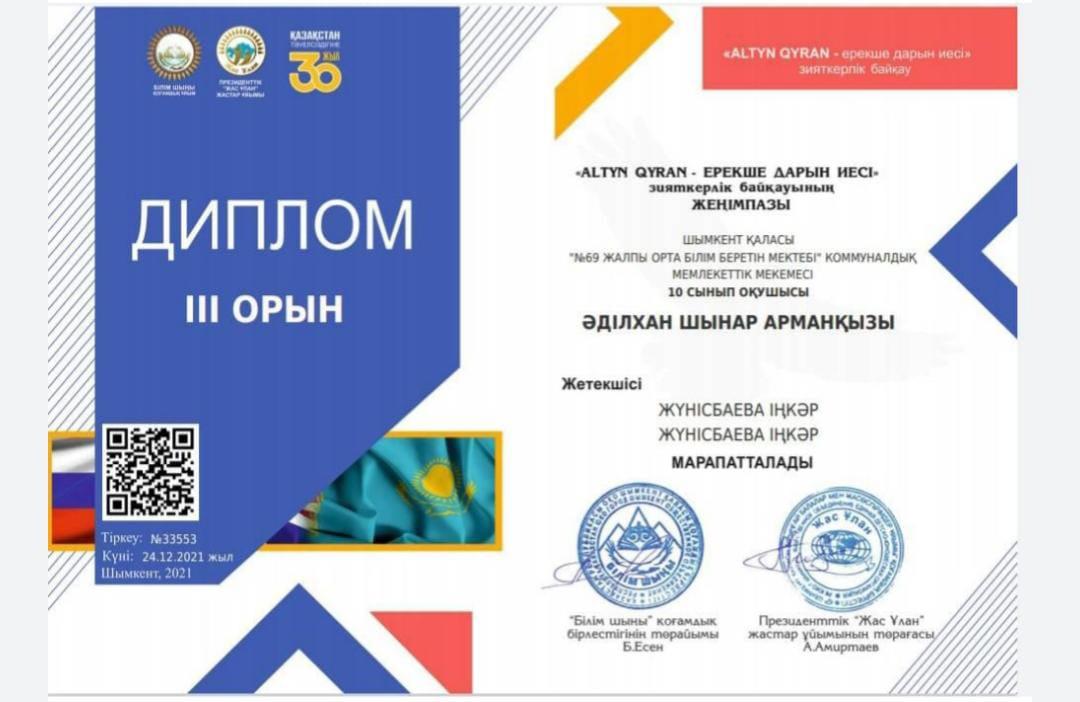 "Altyn Qyran"-ерекше дарын иесі » №69 жалпы орта білім беретін мектебі