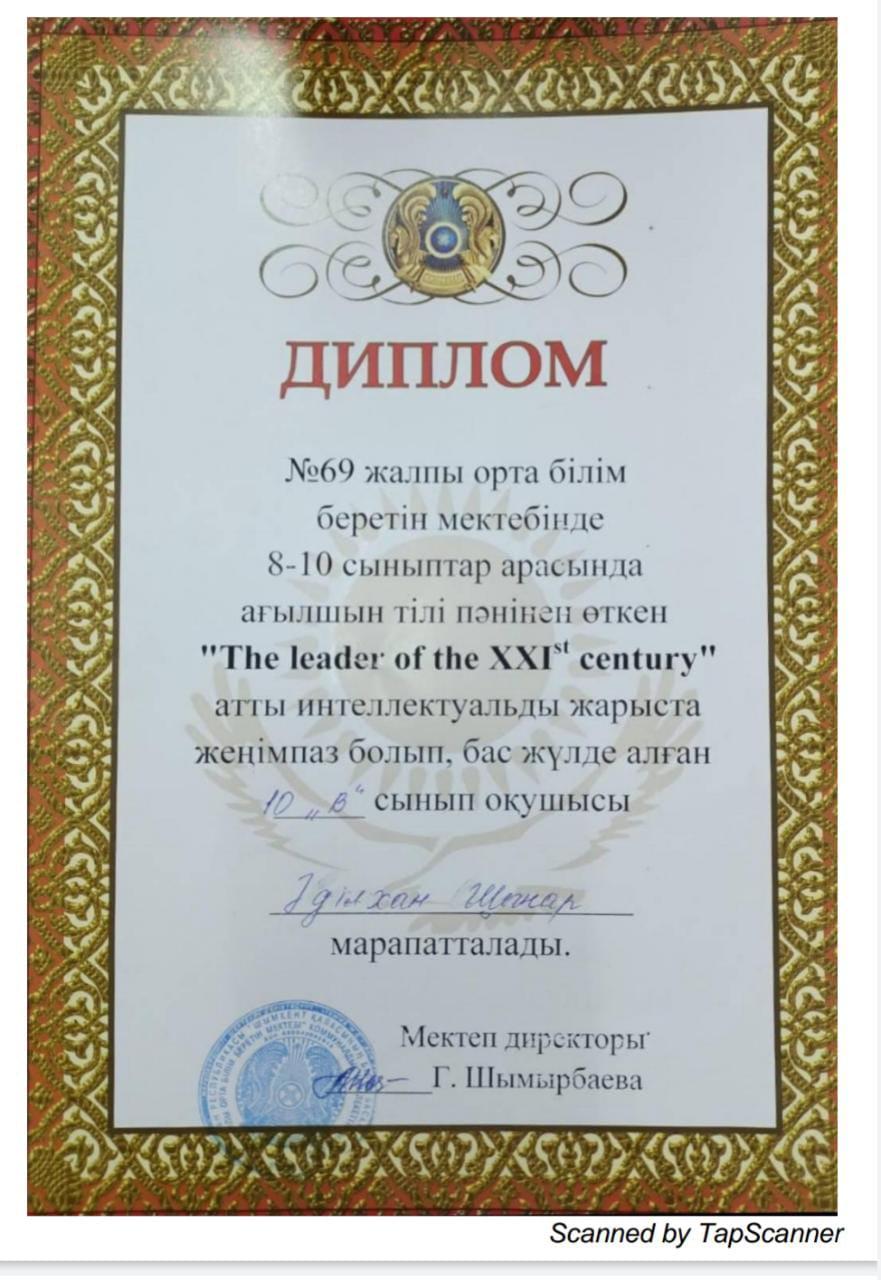 №69 жалпы орта білім беретін мектебінде 8-10 сыныптар арасында ағылшын тілі пәнінен өткен "The Leader of the XXI st century" атты интеллектуалды жарысында Жүнісбаева Іңкәрдің жетекшілігімен қатысқан 10"В" сынып оқушысы Әбілхан Шынар бас жүлде алғаны үшін марапатталды.