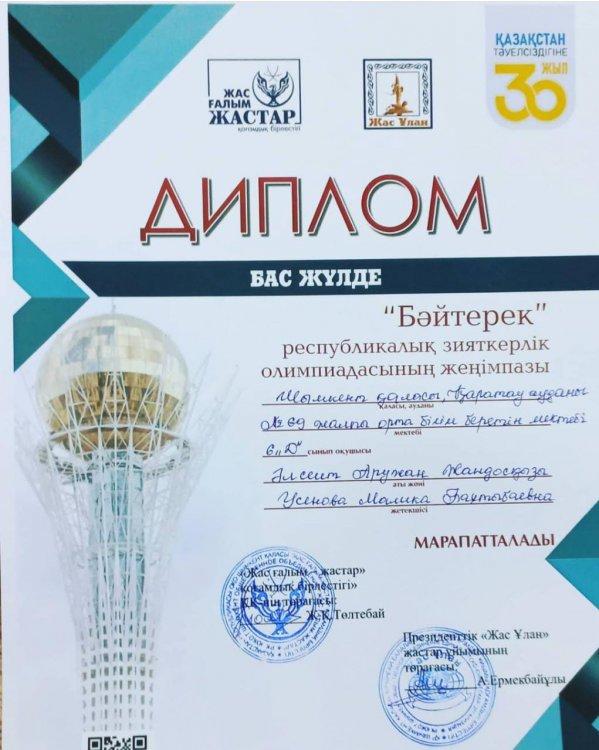 "Бәйтерек" Республикалық зияткерлік олимпиадасының жеңімпазы 6 "ж"  сынып  оқушысы Абдрасил Маржан Бейбітқызы ІІ орын дипломмен  марапатталды. Жетекшісі: Үсенова Малика.