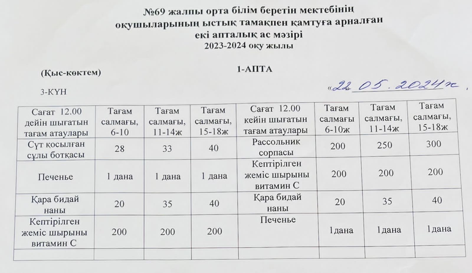 Шымкент қаласының білім басқармасына қарасты №69 жалпы орта білім беретін мектебі 2024жылдың 22 мамыр күнгі ыстық тамақ ас мәзірі. Брокераж комиссиясы тағайындалған асхана жұмысы мен күнделікті тамақтың сапасын және ас мәзірімен сәйкестігін тексеріп, асхана тазалығына бақылау жүргізіледі. Күнделікті дайындалған тағам ас мәзірімен сәйкестендірілген.