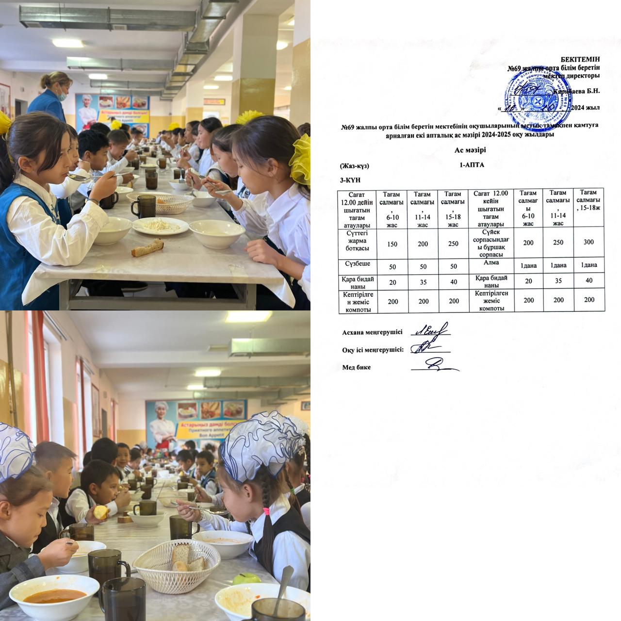 Шымкент қаласының білім басқармасына қарасты №69 жалпы орта білім беретін мектебі 2024жылдың 16 қазан күнгі  ыстық тамақ ас мәзірі
