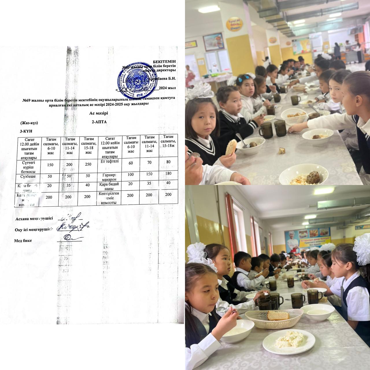 Шымкент қаласының білім басқармасына қарасты №69 жалпы орта білім беретін мектебі 2024жылдың 23 қазан күнгі ыстық тамақ ас мәзірі.